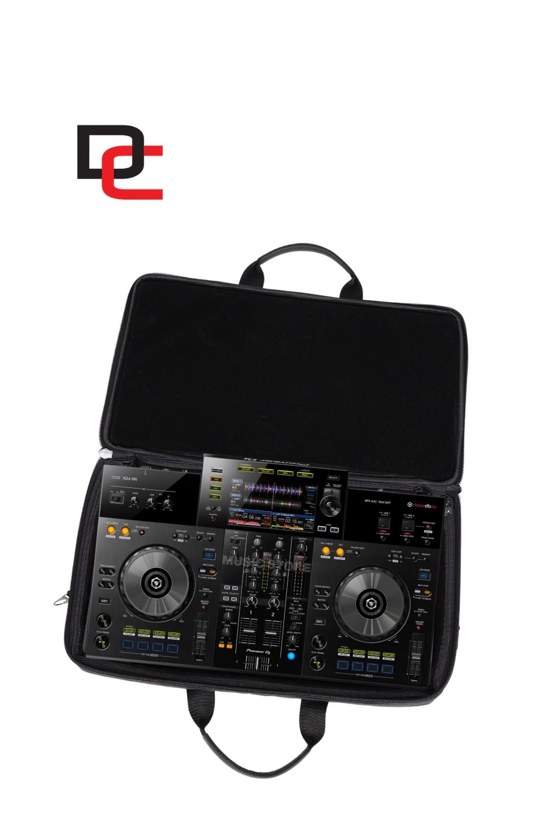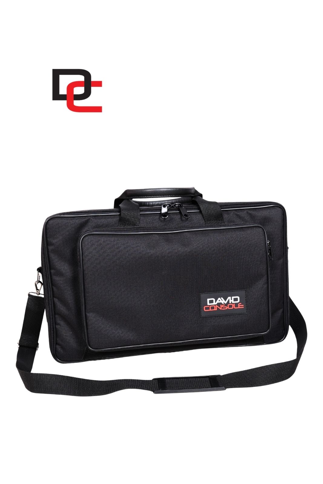 Z przodu znajduje się pojemna kieszeń o wymiarach 40 × 25 cm, idealna na zasilacz, przewody oraz niezbędne akcesoria DJ-skie, dzięki czemu wszystkie elementy zestawu są zawsze pod ręką.
